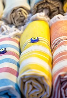El dokuması havlu ve kıyafetlerle her türlü tekstil ürünü, Bodrum’daki mağazaları doldurur. El dokuması Milas Kumaşları özellikle popülerdir.